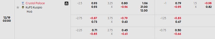 Bảng tỷ lệ kèo bóng đá hôm nay Crystal Palace vs KuPS