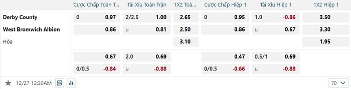 Bảng tỷ lệ kèo bóng đá Derby vs West Brom