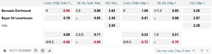 Bảng tỷ lệ kèo bóng đá Dortmund vs Bayer Leverkusen