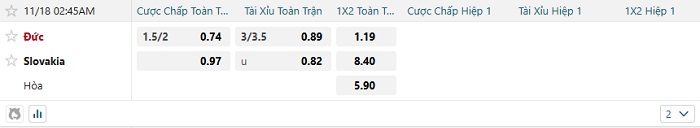 Bảng tỷ lệ kèo bóng đá hôm nay Đức vs Slovakia