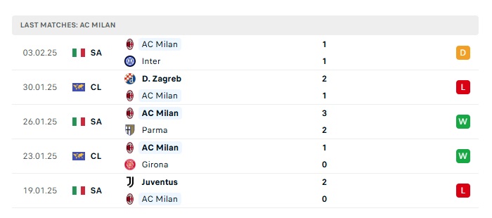 - Phong độ gần đây AC Milan