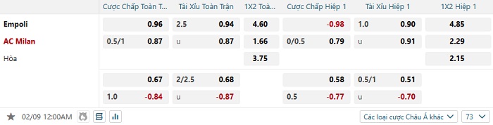 Bảng tỷ lệ kèo bóng đá Empoli vs AC Milan