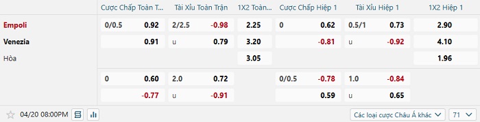 Bảng kèo bóng đá Empoli vs Venezia