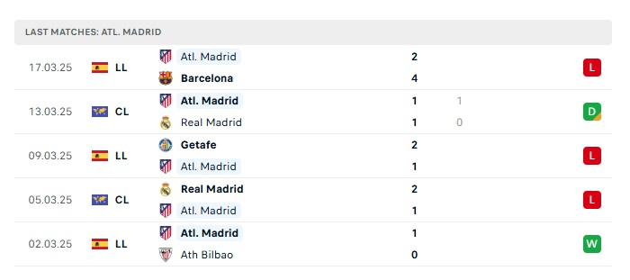 Phong độ gần đây Espanyol vs Atletico Madrid