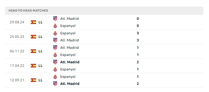 - Kèo tỷ số H2 Espanyol vs Atletico Madrid: 1-3