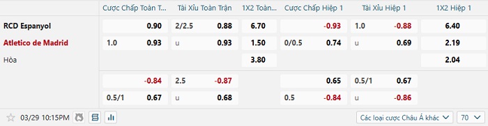 Bảng tỷ lệ kèo bóng đá Espanyol vs Atletico Madrid