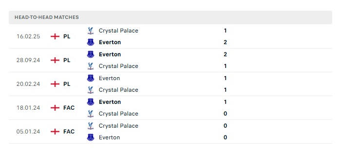 Lịch sử đối đầu Everton vs Crystal Palace