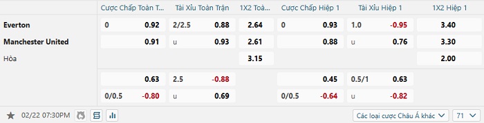 Bảng tỷ lệ kèo bóng đá Everton vs Man Utd