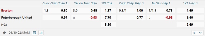 Bảng tỷ lệ kèo bóng đá Everton vs Peterborough Utd
