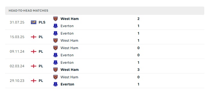 - Kèo tỷ số H2 Everton vs West Ham Utd: 2-0