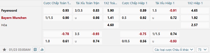 Bảng tỷ lệ kèo bóng đá Feyenoord vs Bayern Munich