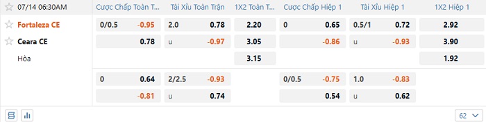Hiện tại nhà cái đang niêm yết cho Fortaleza mức chấp -1/4 và khả năng để họ thắng được kèo châu Á gần như bằng 0. Nên biết rằng với Fortaleza, họ đang có kết quả toàn thua kèo cả 8 trận đấu liên tiếp. trong khi đó thì Ceara hiện tại đang có được 4 thắng kèo trong 7 trận đã qua. Do đó kèo châu Á hôm nay sẽ có đội khách là lựa chọn đầu tư an toàn nhất dành cho người hâm mộ trong cả 2 hiệp.