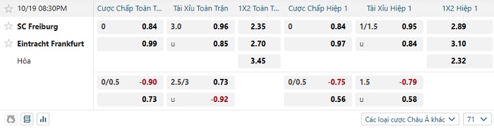 Bảng tỷ lệ kèo bóng đá hôm nay Freiburg vs Frankfurt