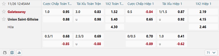 Bảng tỷ lệ kèo bóng đá Galatasaray vs Union Saint-Gilloise