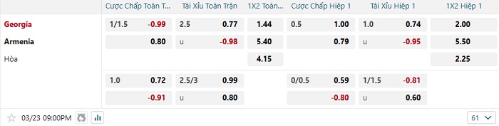 Bảng tỷ lệ kèo bóng đá Georgia vs Armenia
