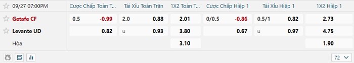 Bảng tỷ lệ kèo nhà cái Getafe vs Levante