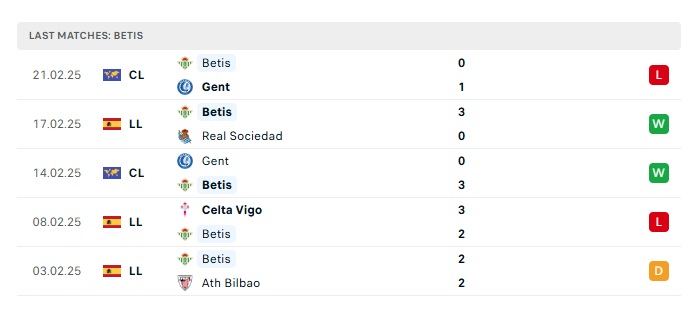 - Phong độ gần đây Real Betis