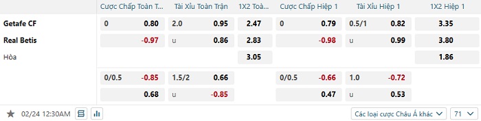 Bảng tỷ lệ kèo bóng đá Getafe vs Real Betis