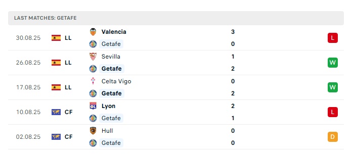 - Phong độ gần đây Getafe