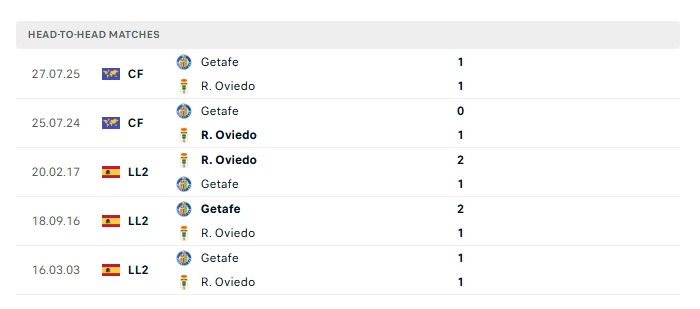 Lịch sử đối đầu Getafe vs Real Oviedo