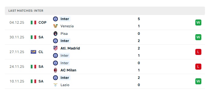 - Phong độ gần đây Inter Milan