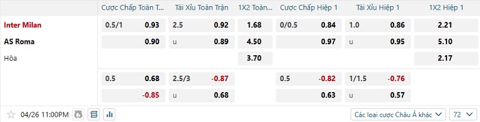 Bảng tỷ lệ kèo bóng đá hôm nay Inter Milan vs Roma