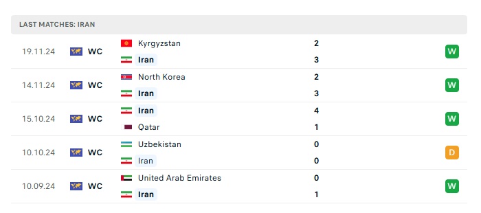 Tất nhiên, phong độ thi đấu trong thời gian qua của Iran đang có sự vượt trội so với đối thủ UAE. Theo ghi nhận trong 10 trận đấu gần nhất của Iran, họ đã bất bại với 8 chiến thắng và chỉ hòa 2. Trong khi đó thì UAE lúc này chỉ thắng 2, hòa 3 và thua 3 trong 8 trận gần nhất. Qua đó, các chuyên gia đều tin rằng đội chủ nhà Iran ngày hôm nay sẽ có cho mình 3 điểm trọn vẹn trước đối thủ hôm nay.