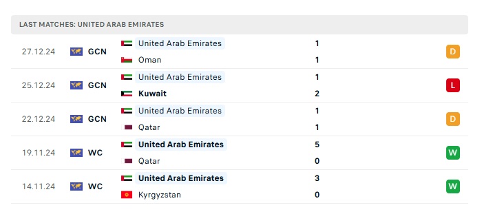 UAE: Eisa; Ebraheim, Al Hammadi, Kouadio, Idrees; Suhail, Hamad, Nader, Al Ghassani; Al-Zaabi; Canedo.
