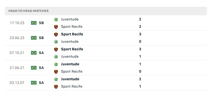 Lịch sử đối đầu Juventude vs SC Recife