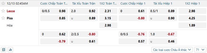 Soi kèo châu Á, kèo Lecce vs Pisa