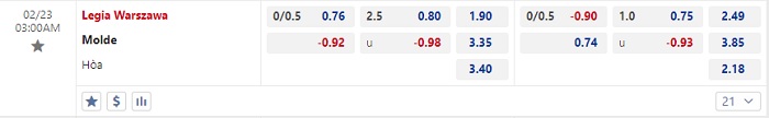 - Kèo tỷ số H2 Legia vs Molde: 1-0