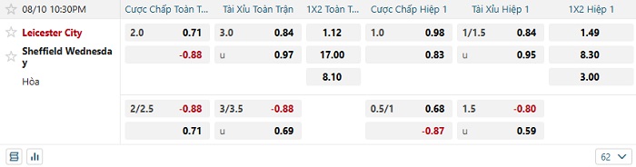 Bảng kèo bóng đá Leicester City vs Sheffield Wed