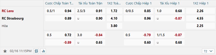 Bảng tỷ lệ kèo bóng đá Lens vs Strasbourg
