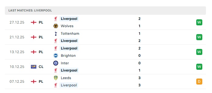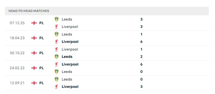 Tính trong vài vòng gần đây, Liverpool có phong độ thi đấu hoàn toàn áp đảo trước đối thủ. Tính trong 7 trận đấu gần nhất của Liverpool, họ đã bất bại với 5 chiến thắng và chỉ hòa 2 trận. Bên kia sân, Leeds trong 9 trận gần nhất chỉ thắng 2, hòa 3 và thua đến 4. Do đó, việc The Kop giành chiến thắng áp đảo trước đối thủ trong ngày hôm nay là kết quả vô cùng dễ đoán.