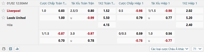 - Kèo tỷ số H1 Liverpool vs Leeds: 1-0