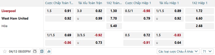 Bảng tỷ lệ kèo nhà cái Liverpool vs West Ham Utd