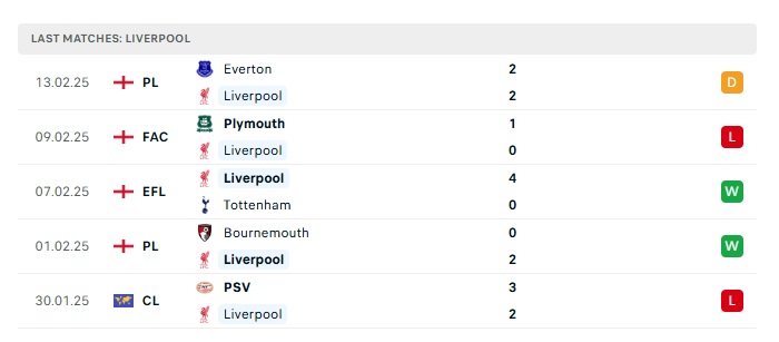 - Phong độ gần đây Liverpool