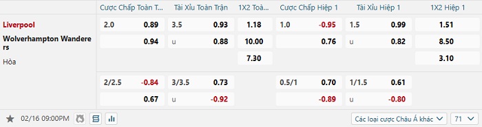 Bảng tỷ lệ kèo bóng đá Liverpool vs Wolves
