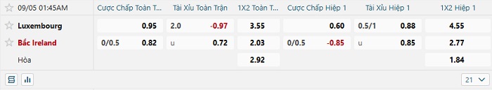 Bảng tỷ lệ kèo bóng đá Luxembourg vs Bắc Ireland