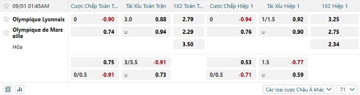 Bảng tỷ lệ kèo bóng đá hôm nay Lyon vs Marseille