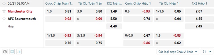 Bảng tỷ lệ kèo nhà cái Man City vs Bournemouth