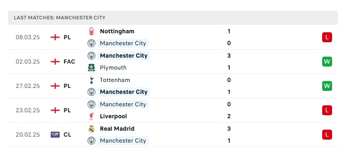 • Phong độ gần đây Man City
