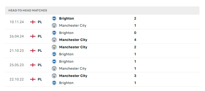 Lịch sử đối đầu Man City vs Brighton