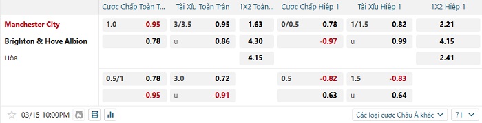 Bảng tỷ lệ kèo bóng đá Man City vs Brighton