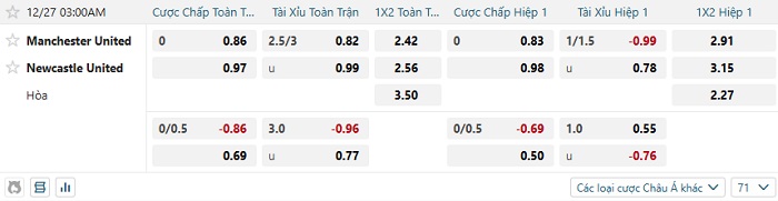 Bảng tỷ lệ kèo nhà cái Man Utd vs Newcastle