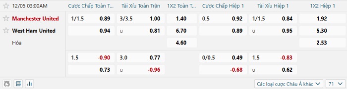 Bảng tỷ lệ kèo bóng đá Man Utd vs West Ham Utd