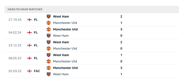 Lịch sử đối đầu Man Utd vs West Ham Utd