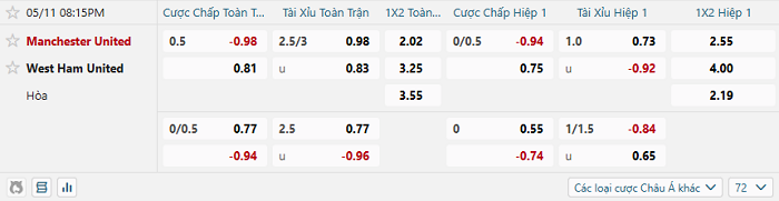 Bảng tỷ lệ kèo bóng đá Man Utd vs West Ham Utd