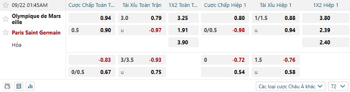 Soi kèo châu Á, kèo Marseille vs PSG
