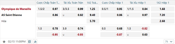Bảng tỷ lệ kèo bóng đá Marseille vs Saint Etienne